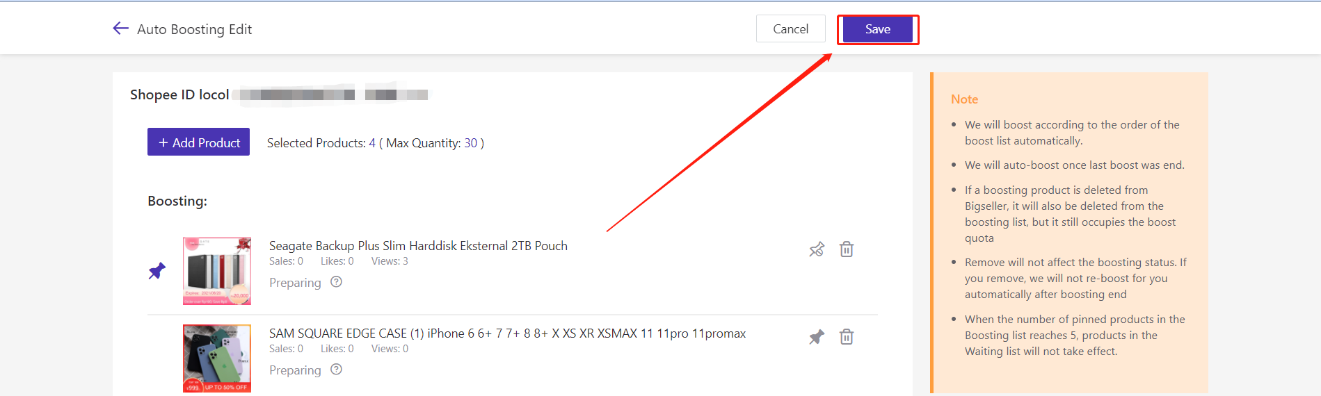 Step3. Now click “Save” and enable the Active button to boost products in shopee. You’ll see the products with a countdown of 4 hours under the Boosting Products tab.