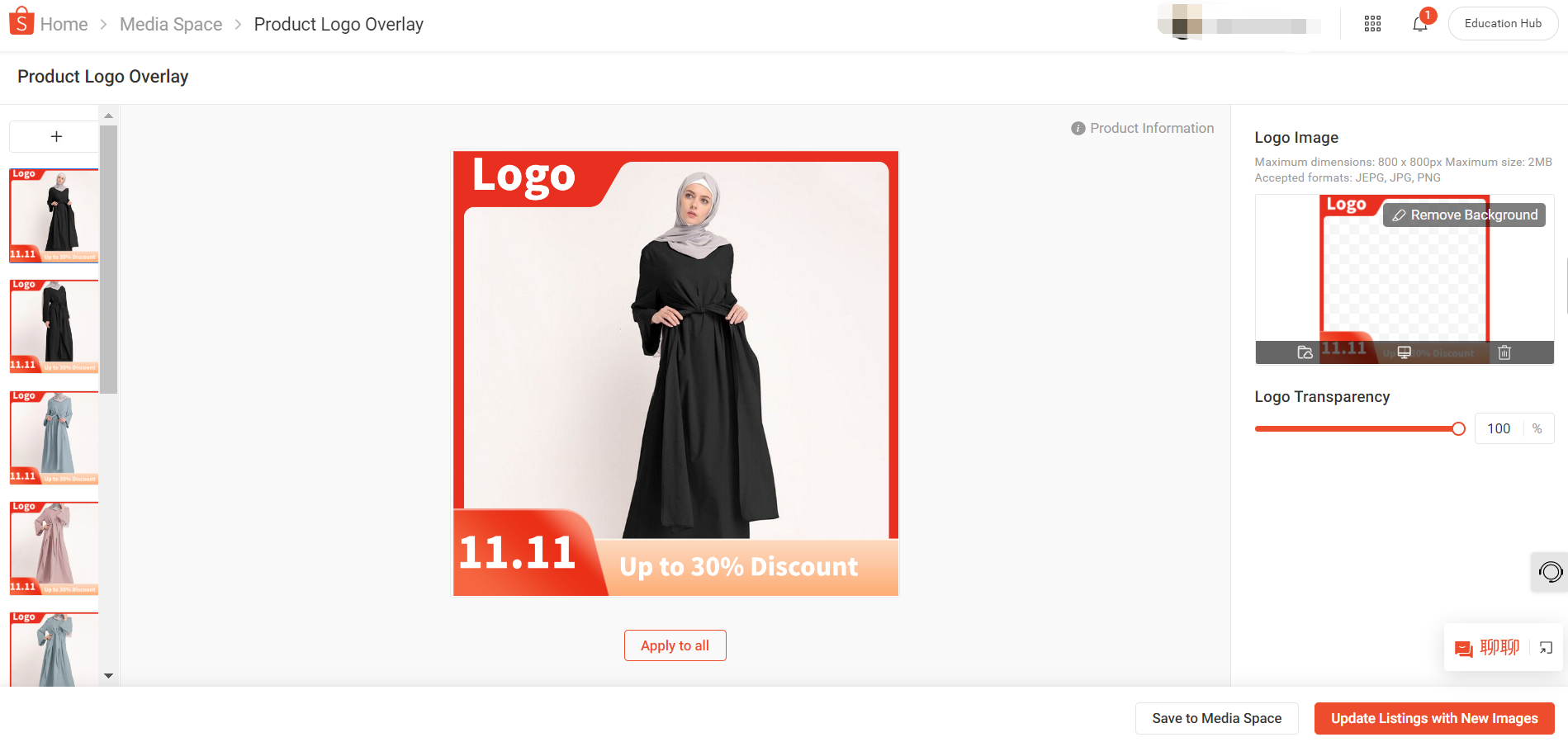 Shopee provides media editing tools: background remover and product logo overlay. To add watermarks to your product images, you can use the product logo overlay.Step 1. Go to Shopee Seller Center > Shop > Media Space, click Product Logo Overlay.