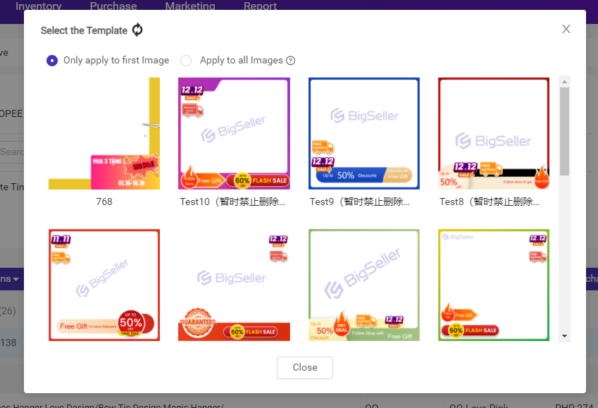 BigSeller supports adding the common watermarks and promotion watermarks. For common watermarks, BigSeller provides 10 watermark templates for free, also you can create your own templates. Then you can go to the BigSeller products page to add watermarks to your draft or active products in bulk, you can select apply to first image or all images.