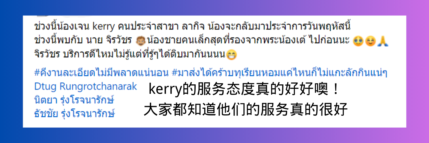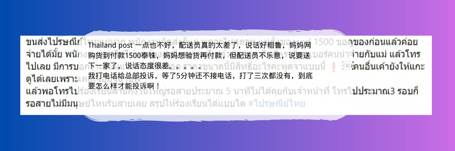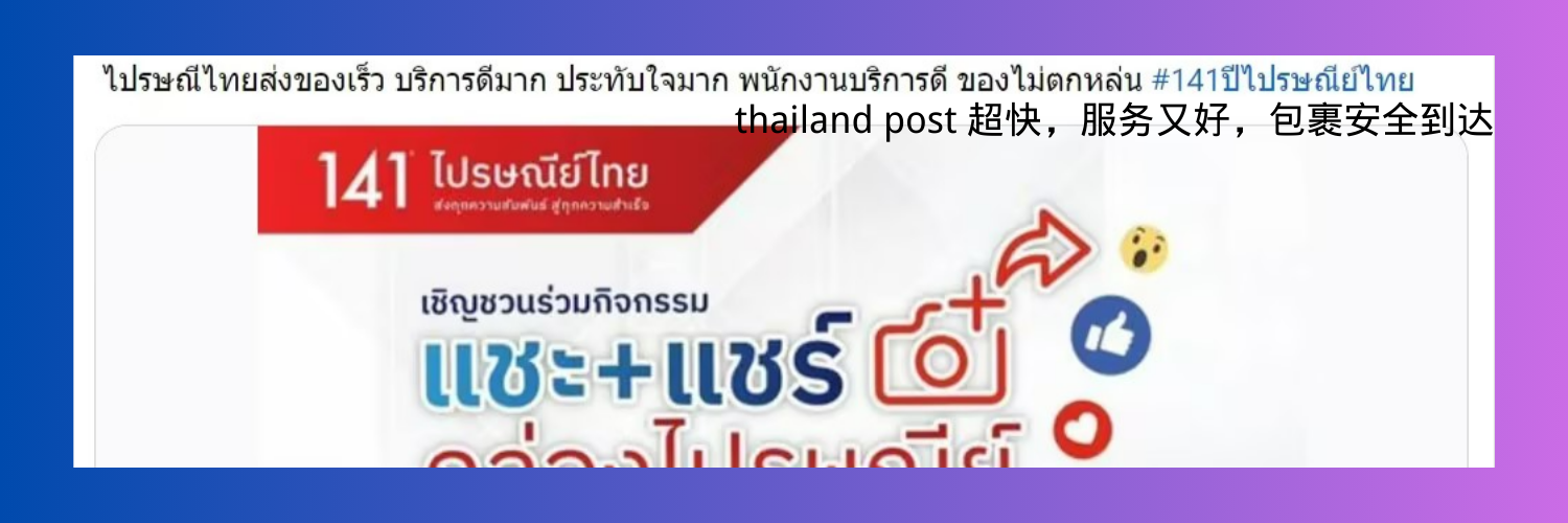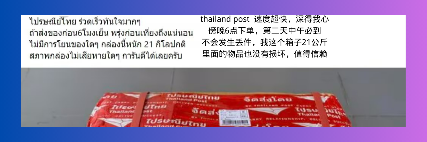 • 评价:在论坛pantip和Facebook上,不少用户反馈其服务稳定,特别是在偏远地区的配送上表现不俗。然而,谈及发货时效性,Thailand Post相对较为保守,大部分包裹在1-3天内送达,但偶尔也会出现因系统更新慢或天气原因导致的延误。