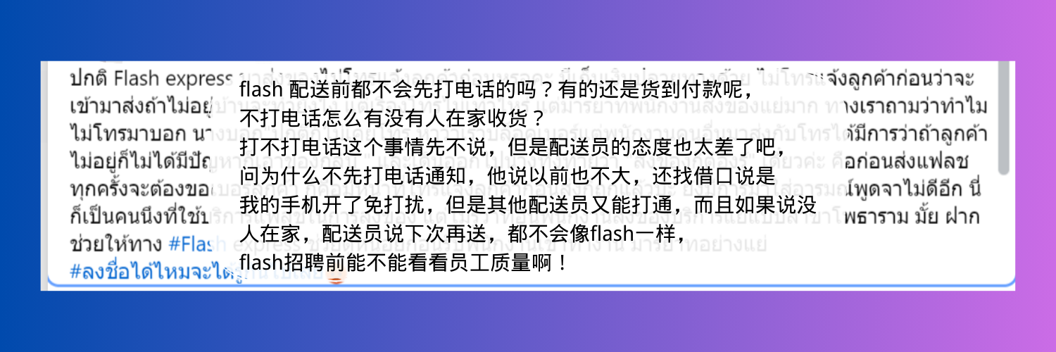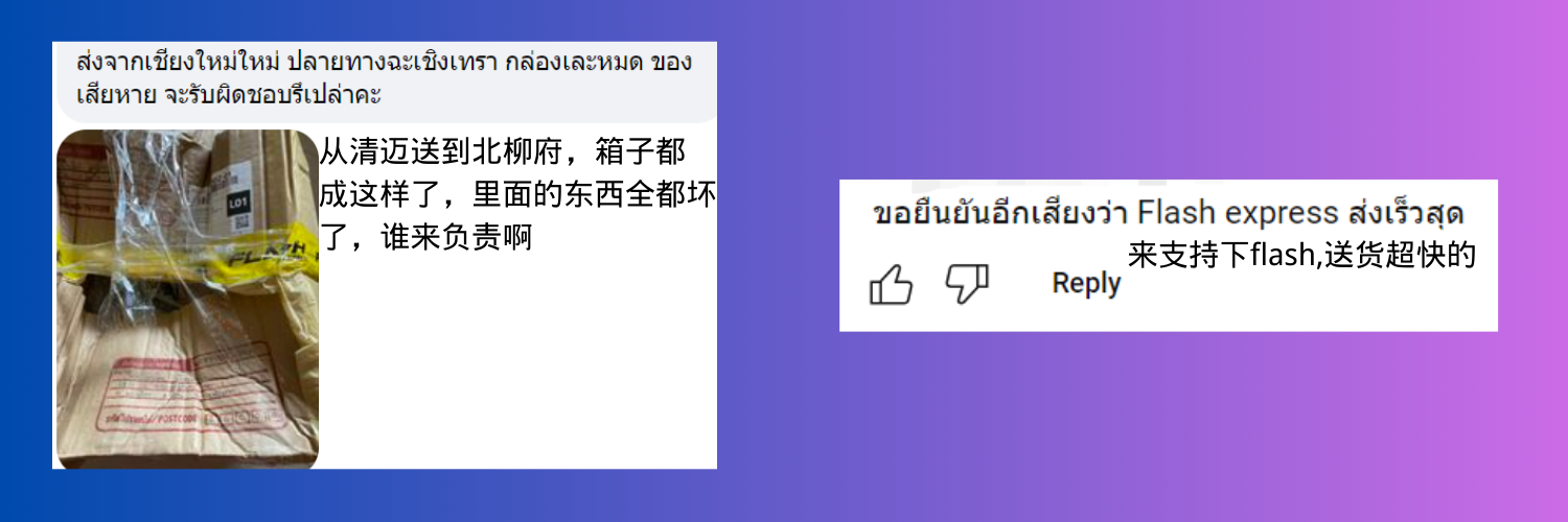 • 评价:Flash Express的全天候运营和发货速度上的卓越表现收获了一批忠实粉丝,但是Flash Express在服务质量方面却频频受到用户的诟病,从pantip和Facebook上的反馈来看,服务态度差和包裹损坏是用户最为不满的两个问题。一些用户反映,在咨询或投诉时,Flash的客服人员态度冷漠,甚至出现推诿责任的情况;而包裹损坏的问题则更为严重,不仅影响了客户的购物体验,还可能给卖家带来不必要的经济损失和纠纷。