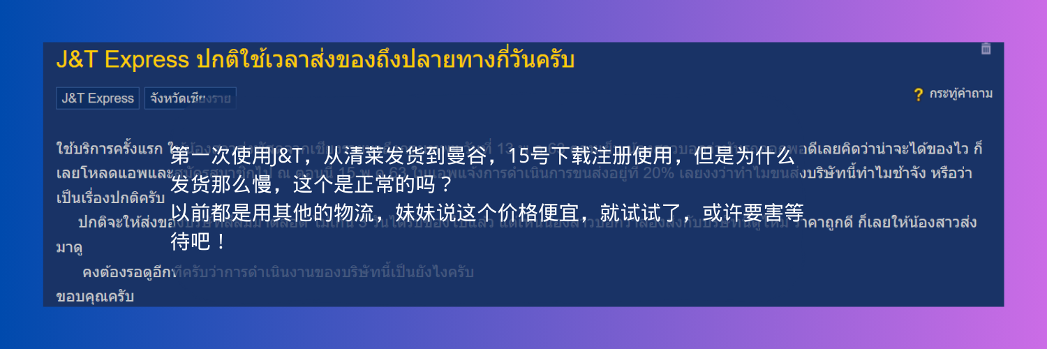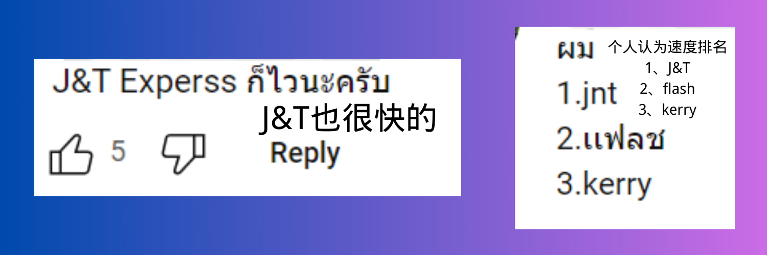 • 评价:从pantip、youtube和facebook等平台网友们的评价中得出,在泰国,J&T Express的服务网络较为广泛,覆盖了许多区域。J&T Express通常提供免费的基本保险,这对于保护中小型卖家的货物很有帮助。但同时一些用户抱怨J&T Express在某些情况下配送时间较长,尤其是偏远地区。