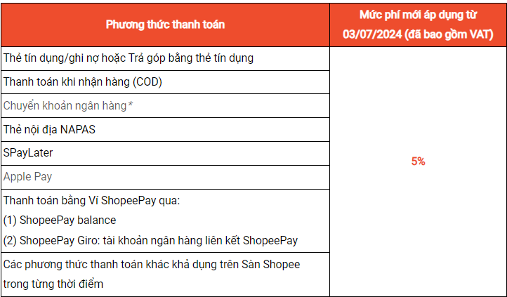 Từ 03/07/2024, Shopee sẽ áp dụng mức Phí thanh toán mới dành cho Người bán là 5% (bao gồm VAT) trên mỗi đơn hàng thành công (đơn hàng nằm ở mục "Đã giao") hoặc đơn có phát sinh yêu cầu.