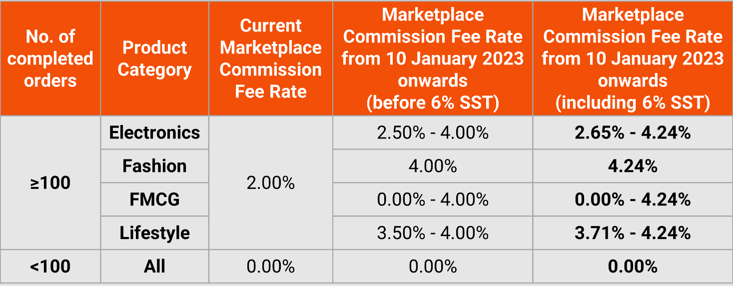 Commission fee = (Product Price - Seller Vouchers - Seller Shipping Promotion) x Commission Rate. And it is subjected to 6% SST.
