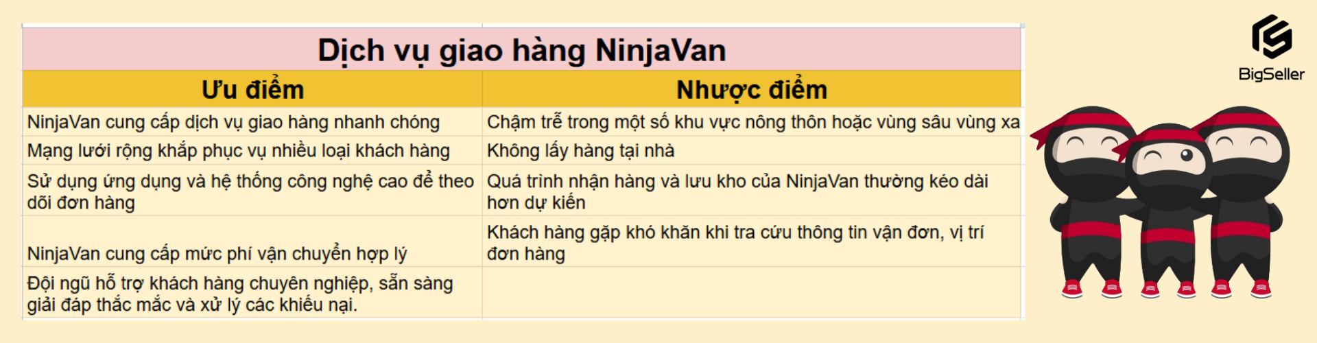 Để giúp bạn có cái nhìn bao quát, tổng thể hơn, BigSeller trong bài viết này sẽ chỉ ra các ưu điểm và nhược điểm của Ninja Van, ưu điểm của NinjaVan là cung cấp dịch vụ giao hàng nhanh chóng, mạng lưới rộng khắp phục vụ nhiều loại khách hàng, sử dụng ứng dụng và hệ thống công nghệ cao để theo dõi đơn hàng, v.v..