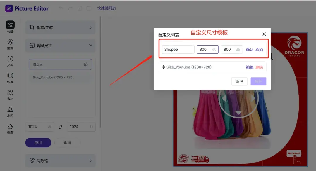 功能亮点:支持自定义图片尺寸,满足不同电商平台的图片规格需求。