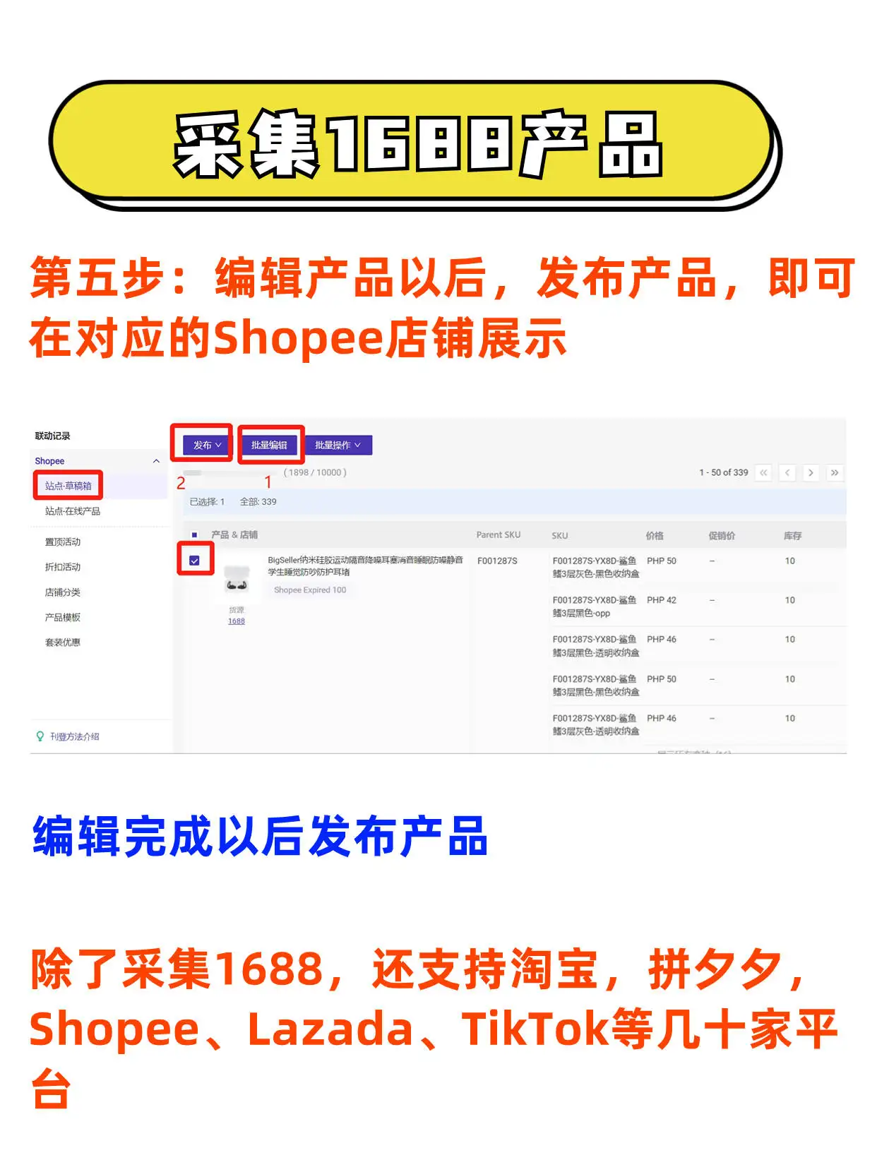 使用BigSeller ERP,卖家可以轻松实现1688到Shopee的批量铺货。只需简单几步,就能将商品上架到你的Shopee店铺:
