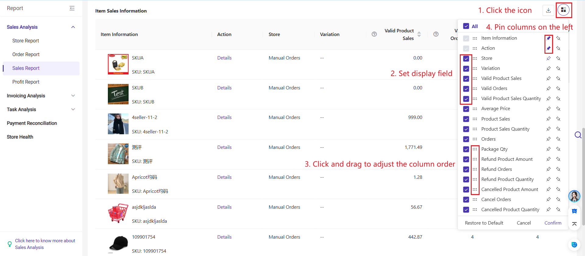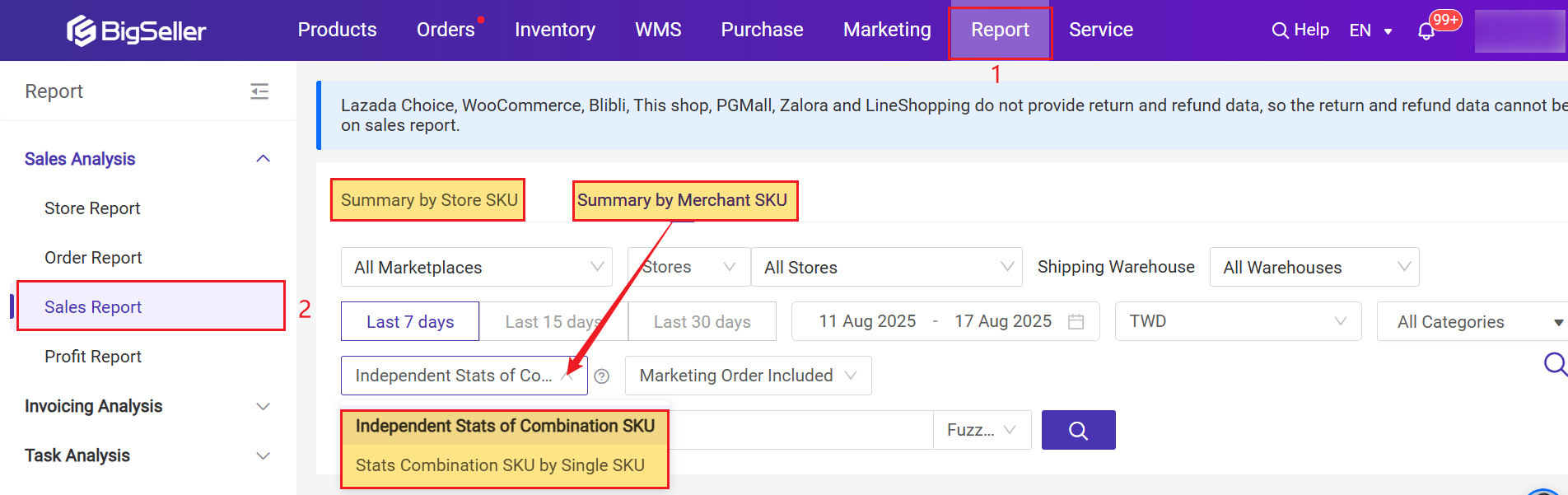 BigSeller has a complete Sales Analysis feature, which can collect statistics from multiple dimensions such as orders, profits, stores, SKUs, etc. The most important thing is that it can collect statistics on all related platforms and stores in one stop, without the need for sellers to manually collect statistics separately, and it supports exporting relevant profit reports at any time.