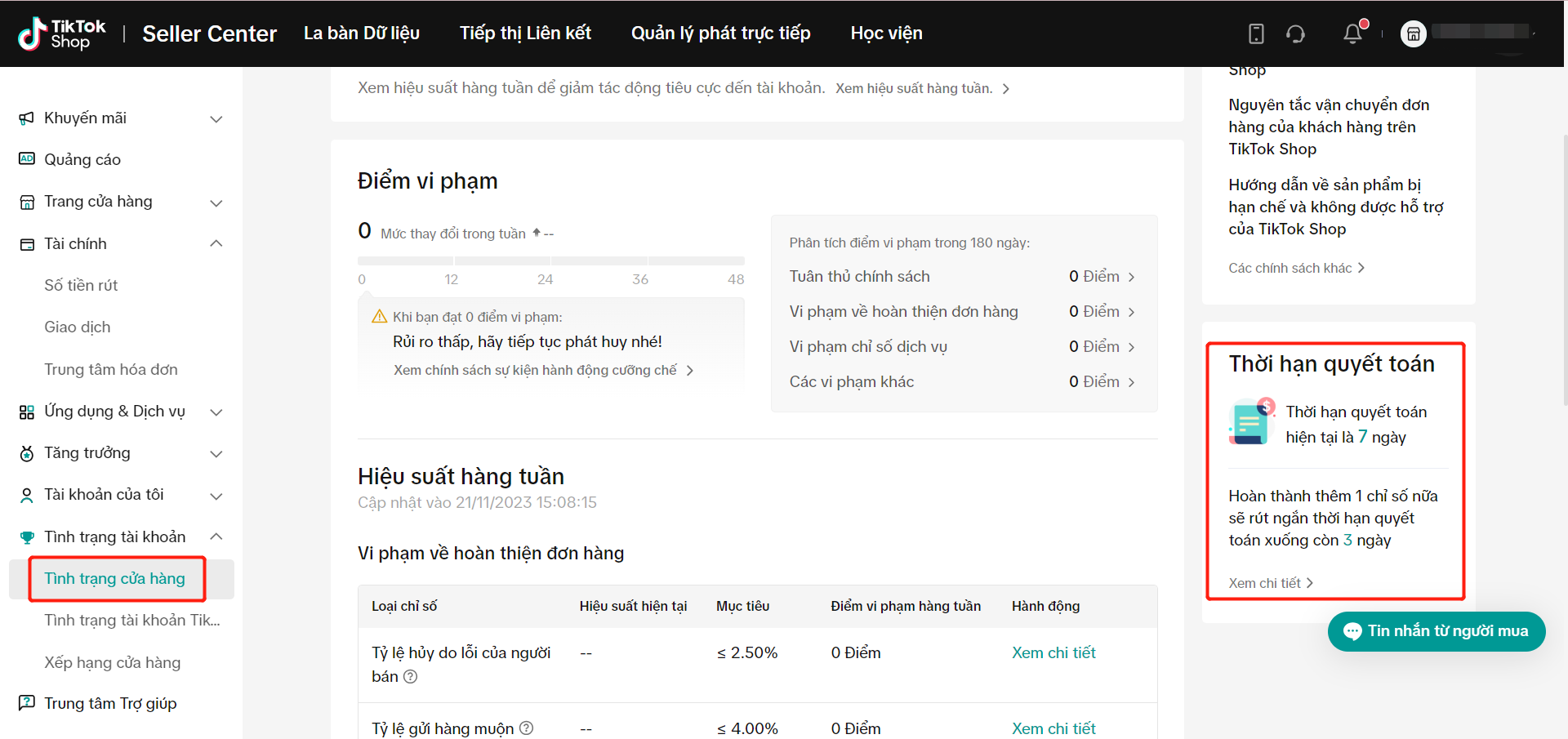 Lưu ý: Để biết gian hàng của mình thuộc loại chu kỳ quyết toán nào, bạn có thể vào trang tình trạng cửa hàng để kiểm tra.
